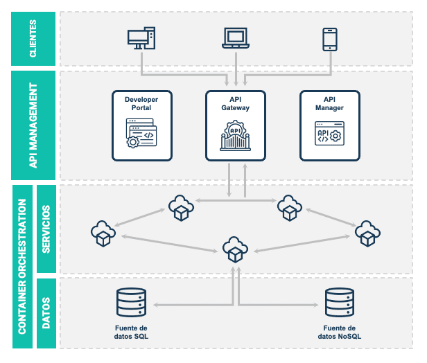 Por eso nos apoyamos en 3 pilares fundamentales: el desarrollo desacoplado basado en microservicios, los sistemas de soporte al acceso y gestión integral de las APIs y el despliegue y la orquestación eficiente de los sistemas gracias a las tecnologías de contenedores.